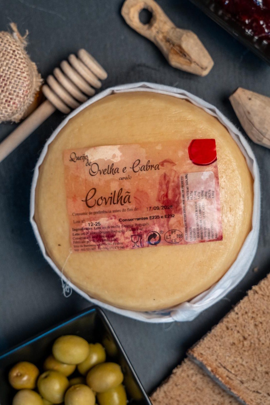 Detalhes: leite de ovelha e cabra, coalho e sal. Cura minima de 35 dias, textura estruturada e sabor persistente.